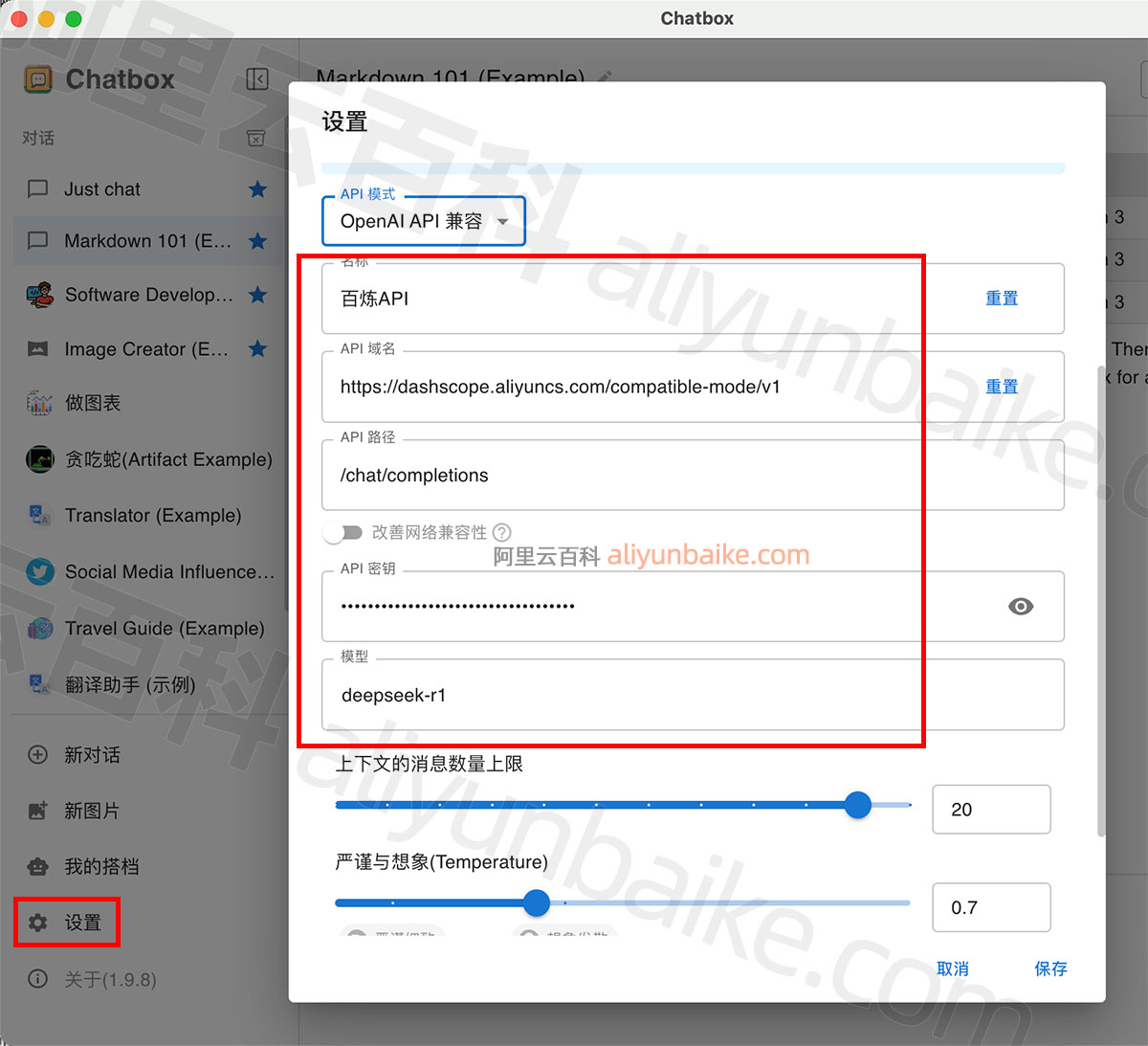 2、运行Chatbox并配置百炼API,按照下表一一设置填写: