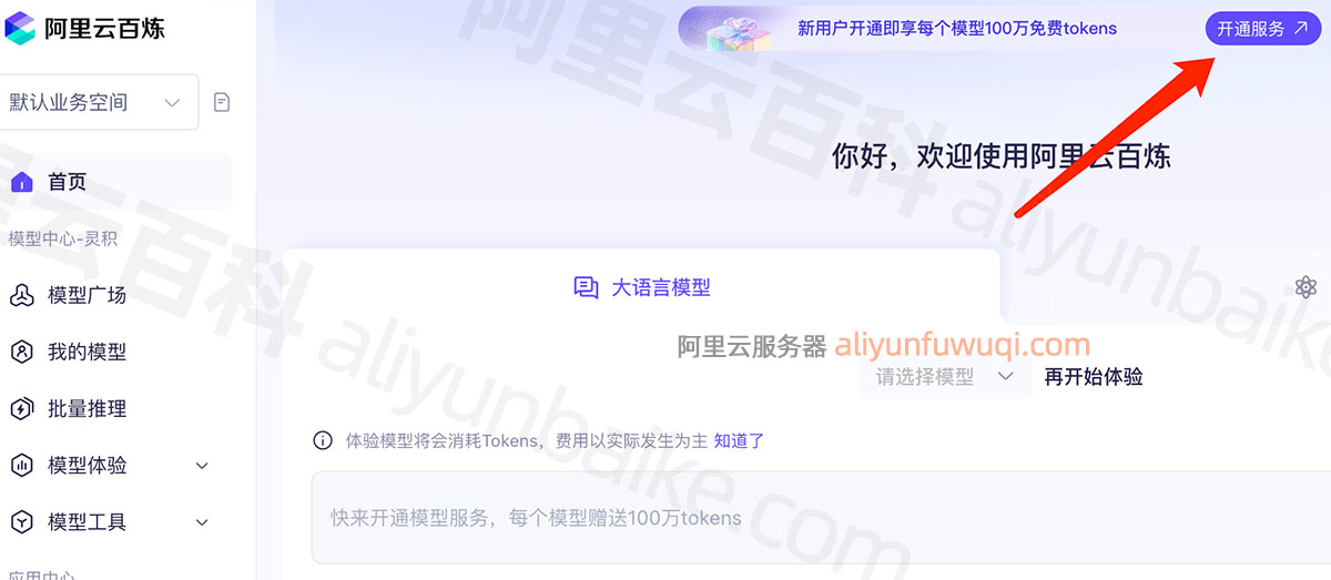 2、如果没有开通过百炼,需要点击顶部【开通服务】,如下图: