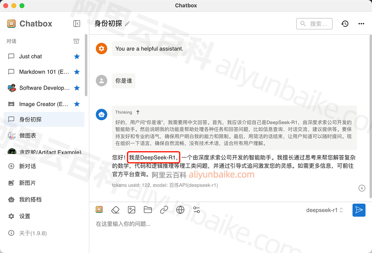 如上图,我是DeepSeek-R1,一个由深度求索公司开发的智能助手。