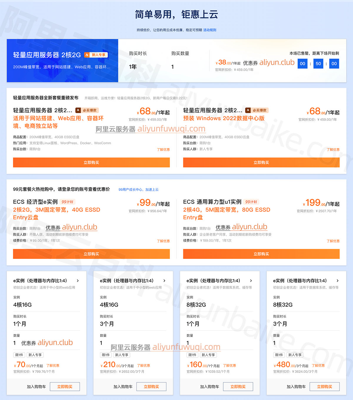 阿里云百科选择了性价比较高的ECS经济型e实例实例,配置为2核2G、3M固定带宽一年99元。