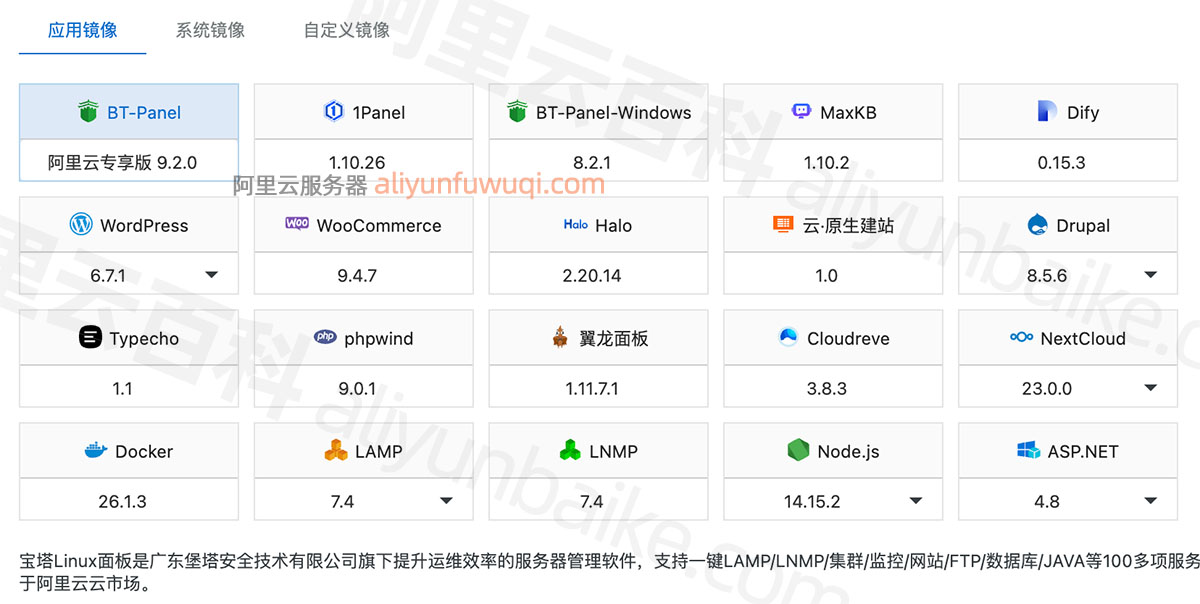 轻量应用服务器的一个特点就是支持阿里云官方提供的应用镜像:BT-Panel、1Panel、宝塔Windows面板、MaxKB、Dify、WordPress、WooCommerce、Halo、云·原生建站、Drupal、Typecho、phpwind、翼龙面板、Cloudreve、Nextcloud、Docker、LAMP、LNMP、Node.js、ASP.NET等,详细如下: