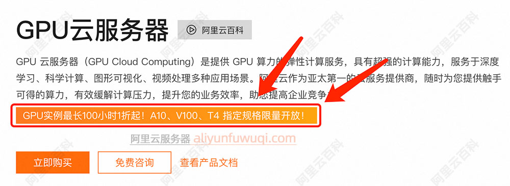打开阿里云GPU服务器页面:aliyunfuwuqi.com/go/gpu 链接打开后点击【GPU实例最长100小时1折起!A10、V100、T4 指定规格限量开放!】如下图: