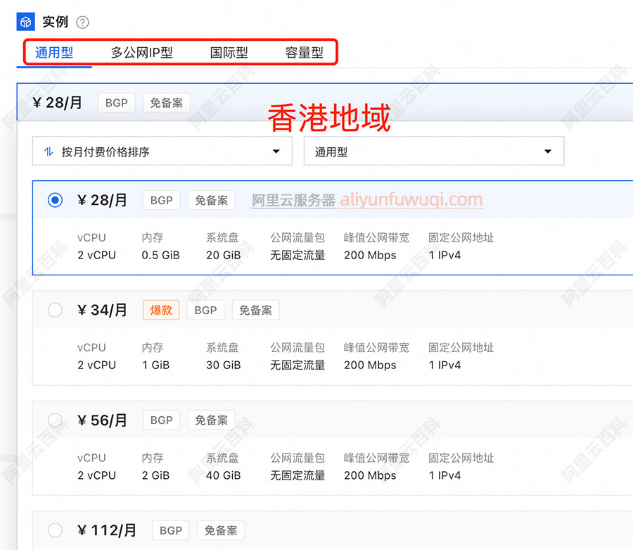 | 国际型28元/月 | 2核 | 1GB | ESSD 30GB | 限峰值带宽200Mbps | 公网线路类型BGP_NCO | 1 IPv4 |