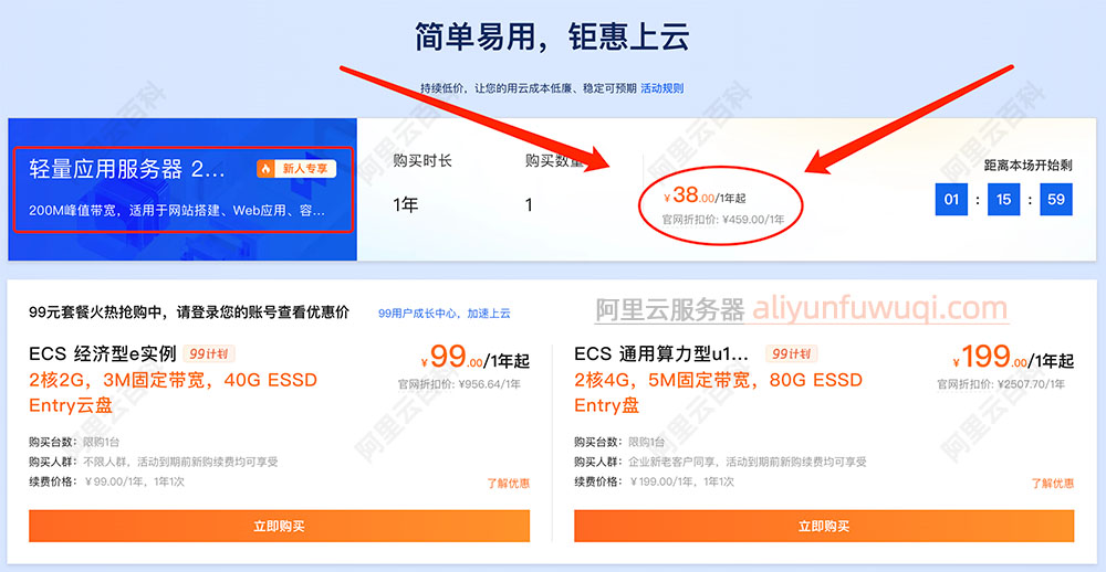 注意:这台目前阿里云最便宜的服务器购买条件是新用户,如果是老用户可以购买99元服务器,也是这个链接,老用户最便宜的配置是99元一年,是一台云服务器ECS,3M固定带宽,续费也是99元一年,也很值得买。