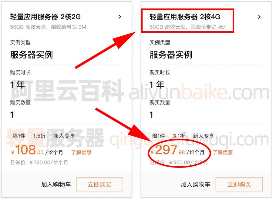 在阿里云官方活动上:aliyunfuwuqi.com/go/aliyun 有一款2核4G配置的轻量应用服务器,4M带宽,优惠价一年297.98元,如下图: