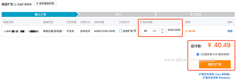 - 4、选择“扩容后容量”,系统会自动算出扩容磁盘需要支付的差价,点击“确定扩容”即可