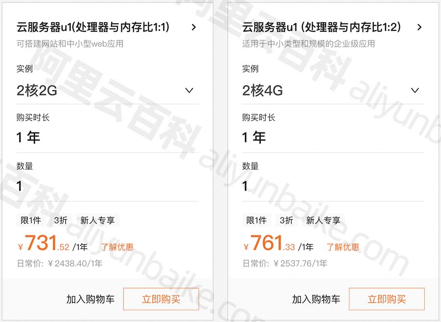 | 云服务器u1(ecs.u1-c1m1.large) | 2核2G | 1M/2M/3M/4M/5M | 40GB ESSD云盘 | 731.52元1年 |