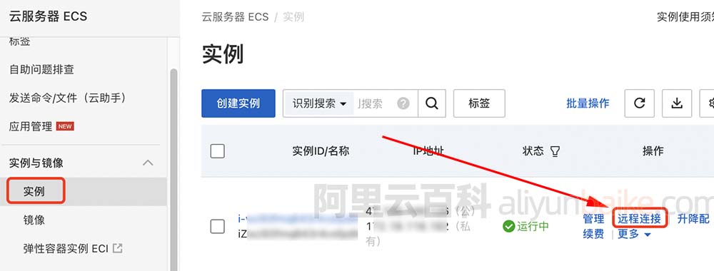 2、在左侧栏“实例”中找到想要远程连接的云服务器,然后点击右侧的“远程连接”,如下图: