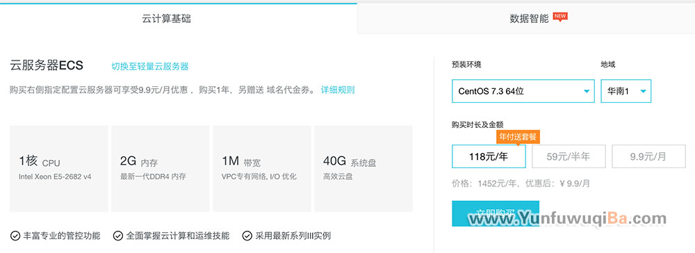 配置:1核CPU(Intel Xeon E5-2682 v4)、2G内存(最新一代DDR4内存)、1M带宽(VPC专有网络 I/O优化)、40G系统盘(高效云盘);